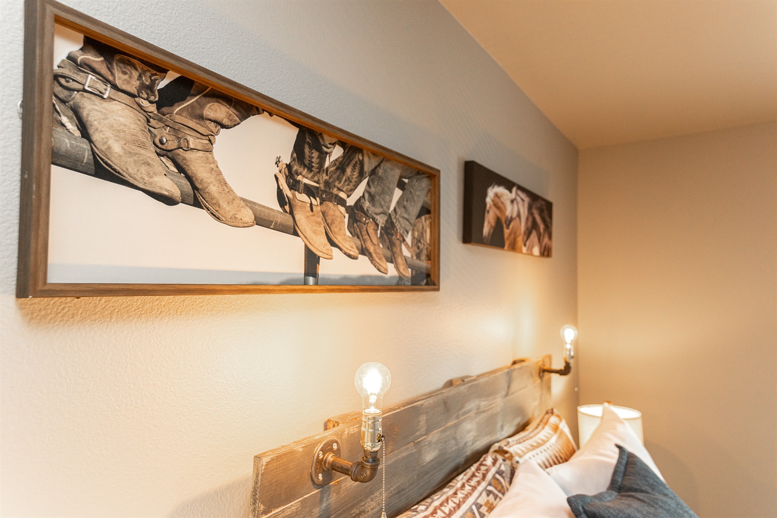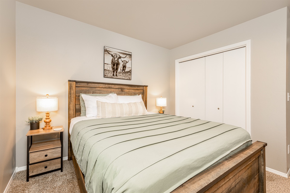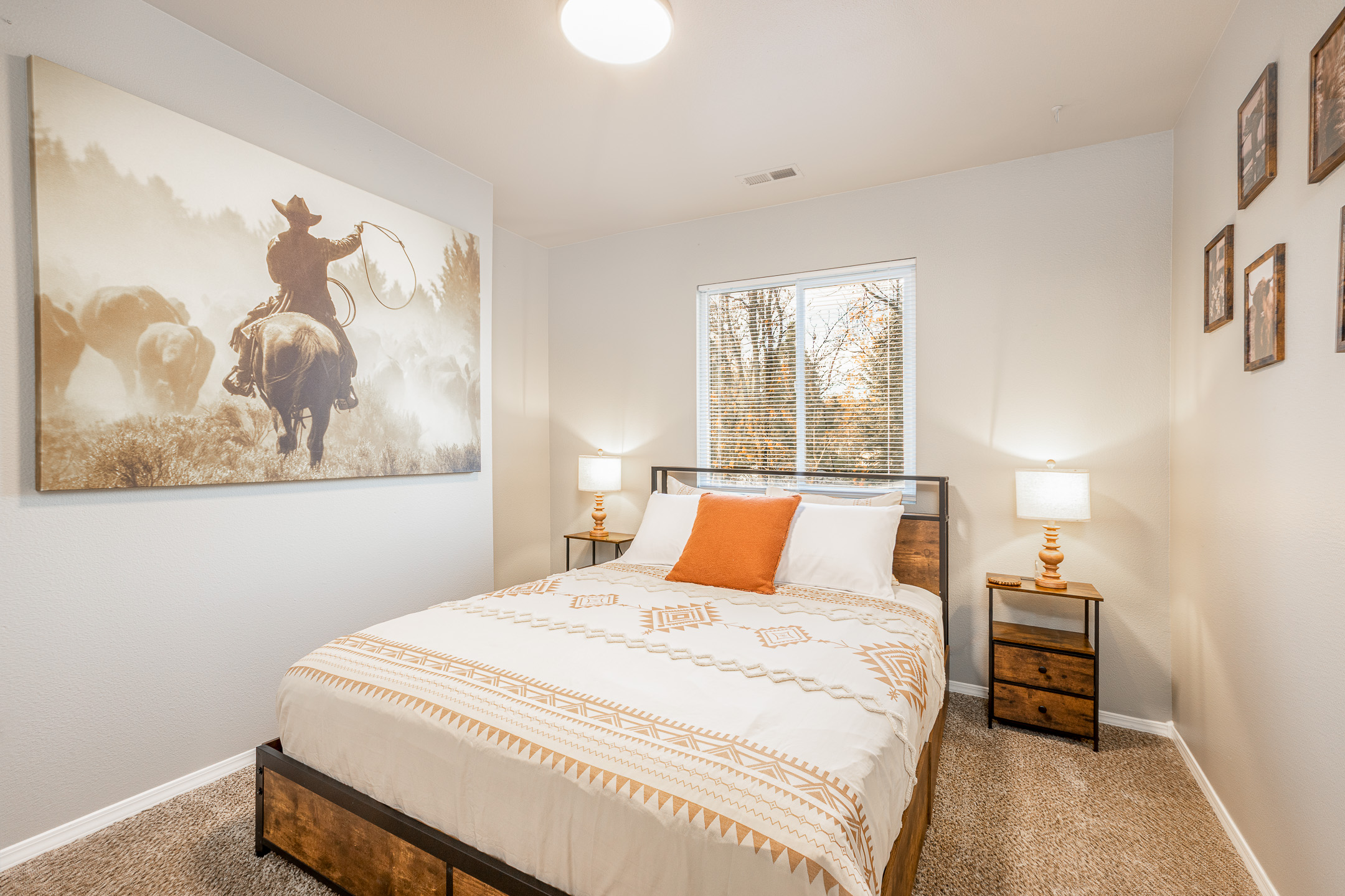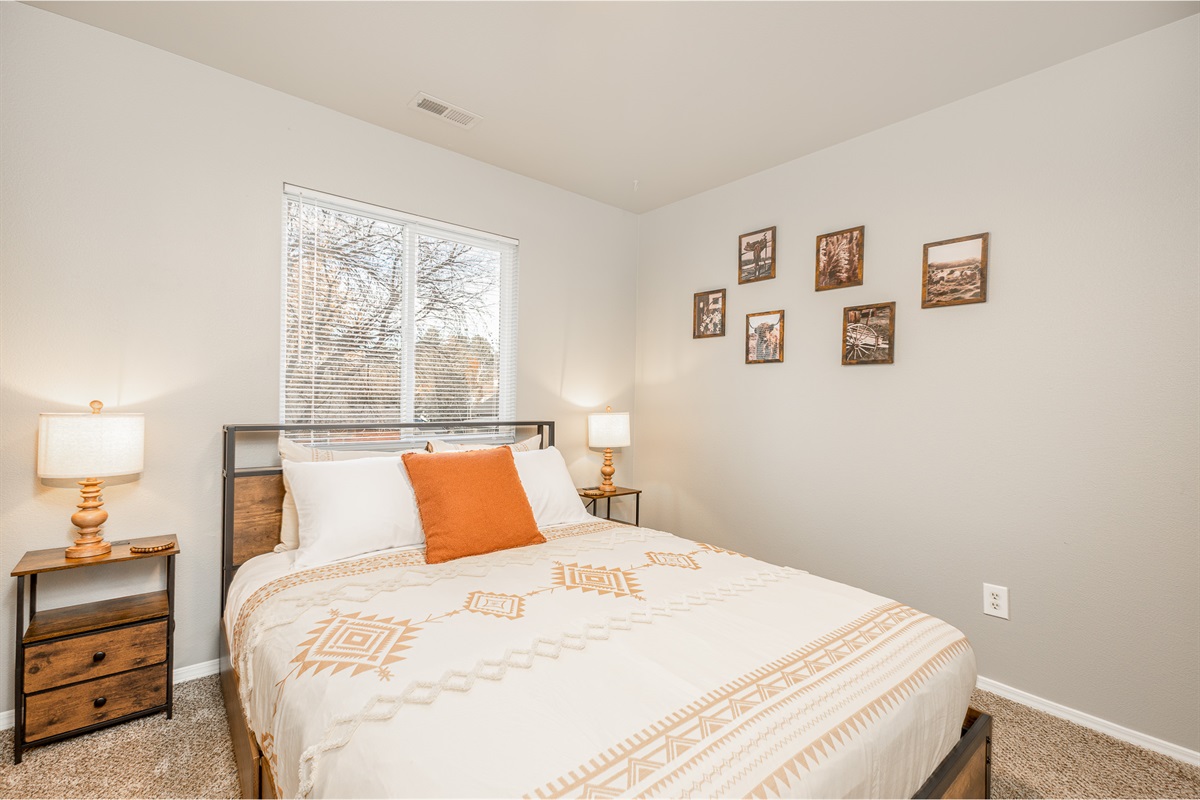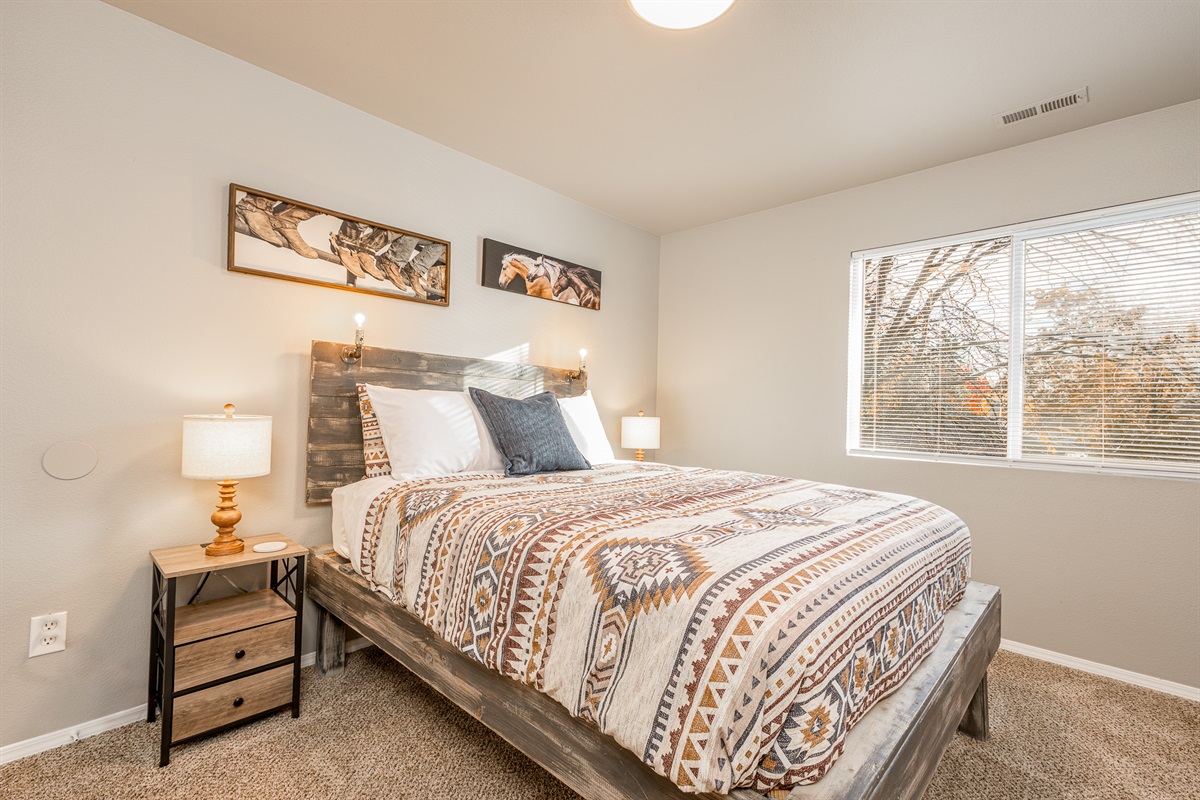 • Three comfortable bedrooms featuring soft bedding and rustic Western touches