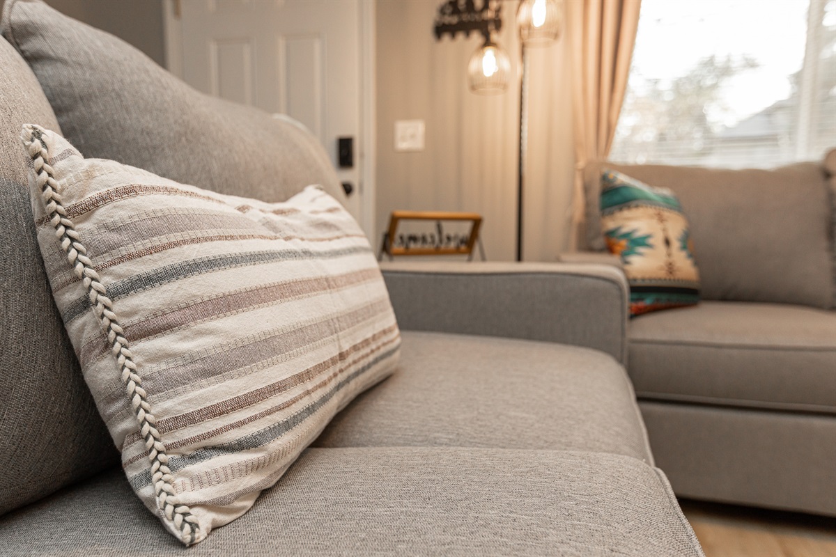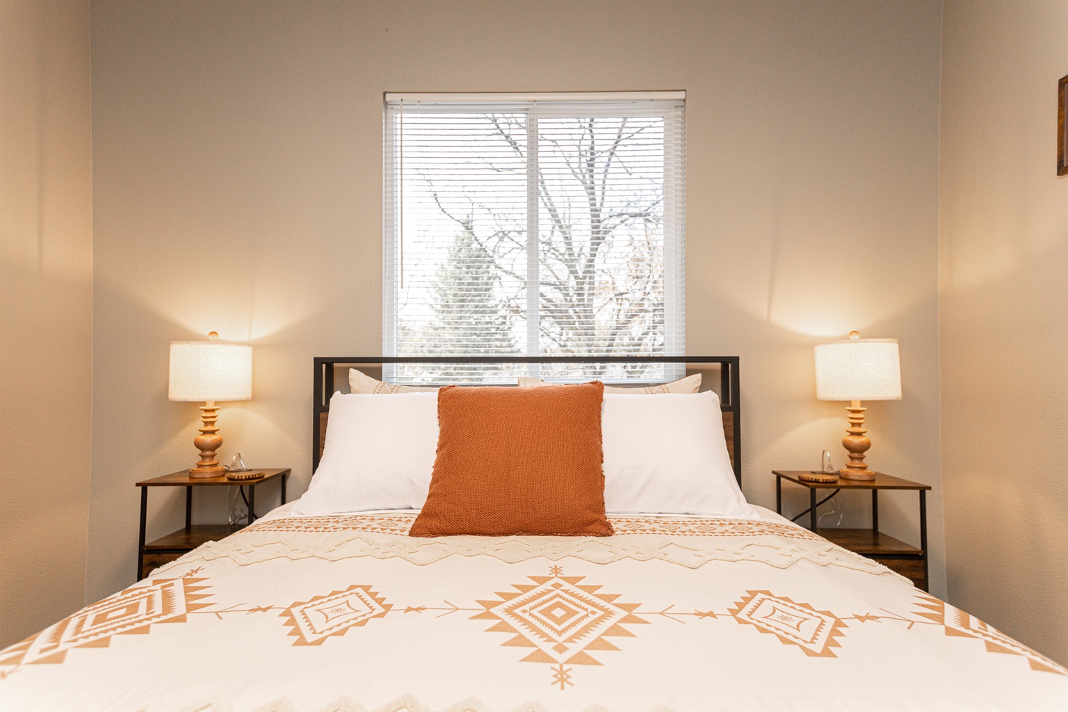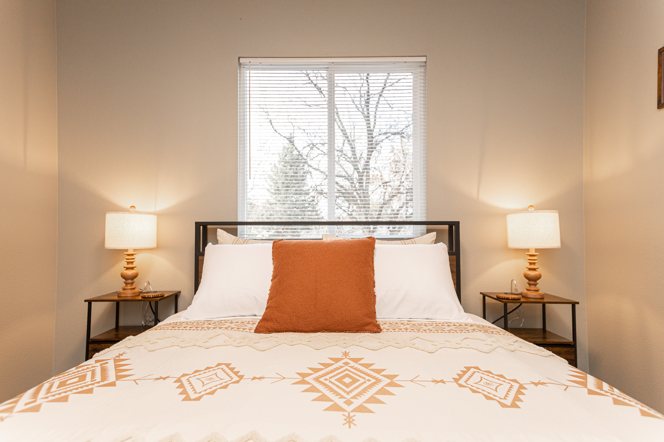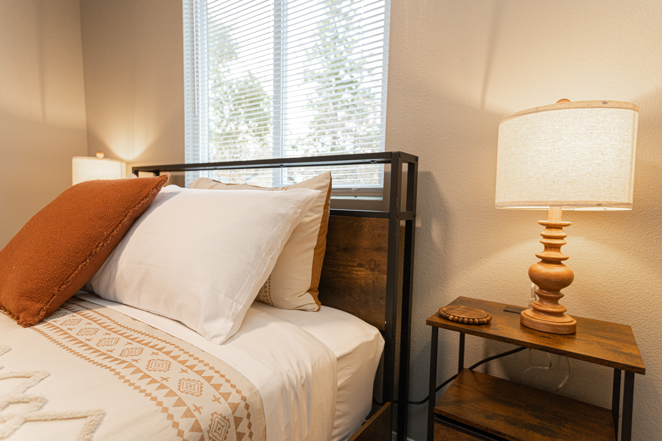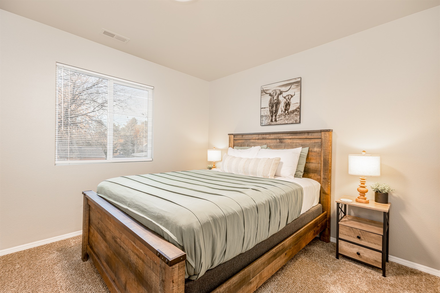 • Three comfortable bedrooms featuring soft bedding and rustic Western touches