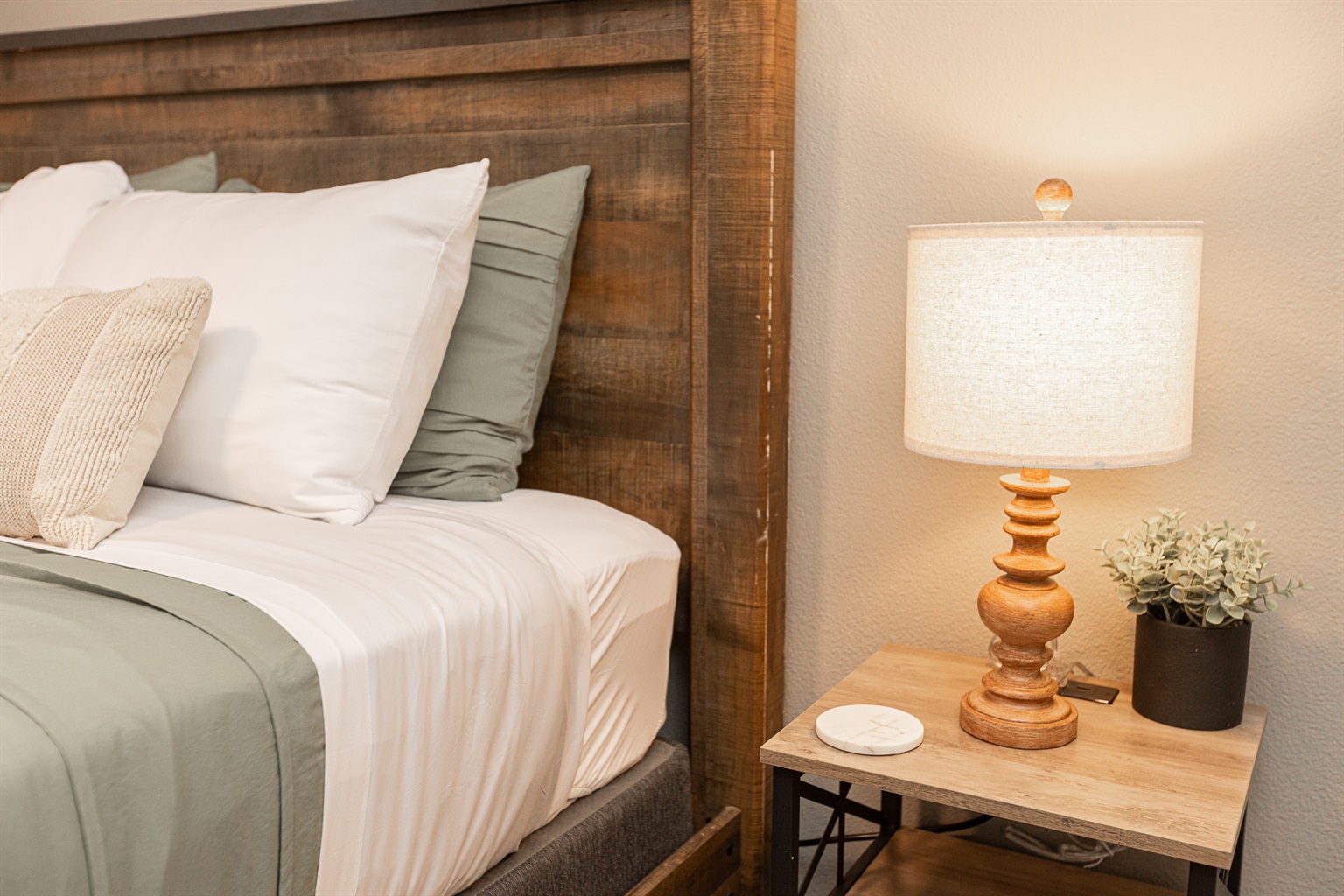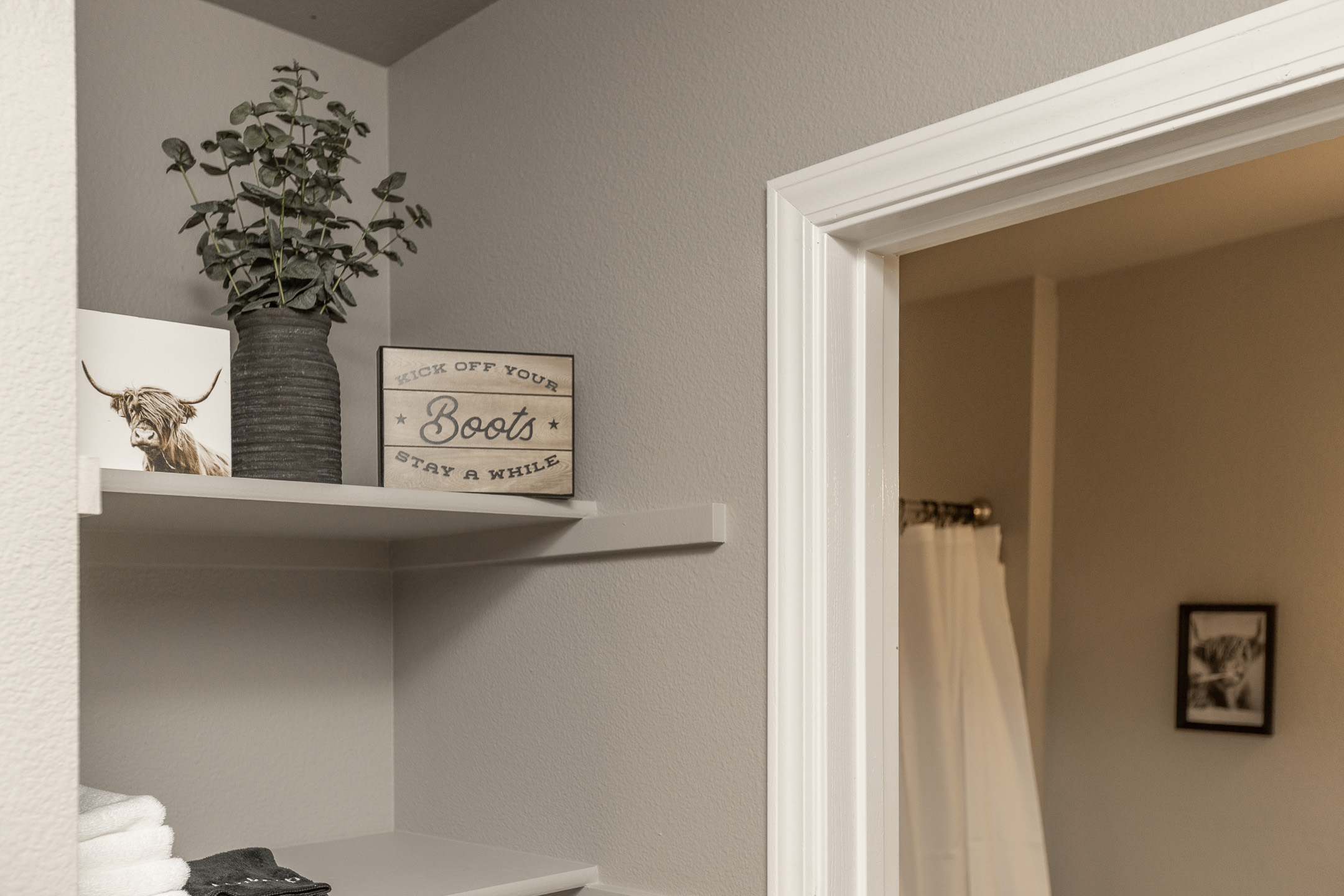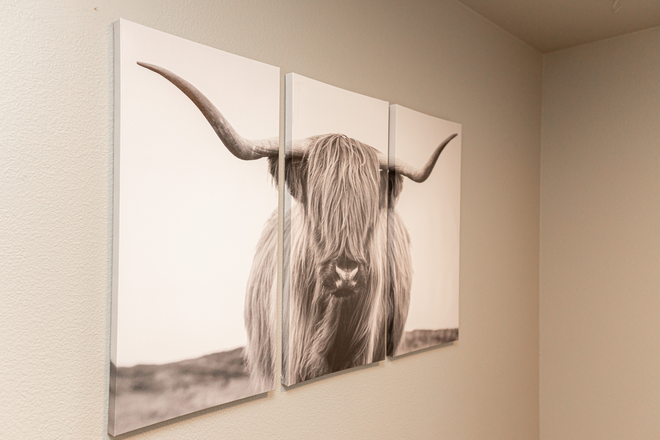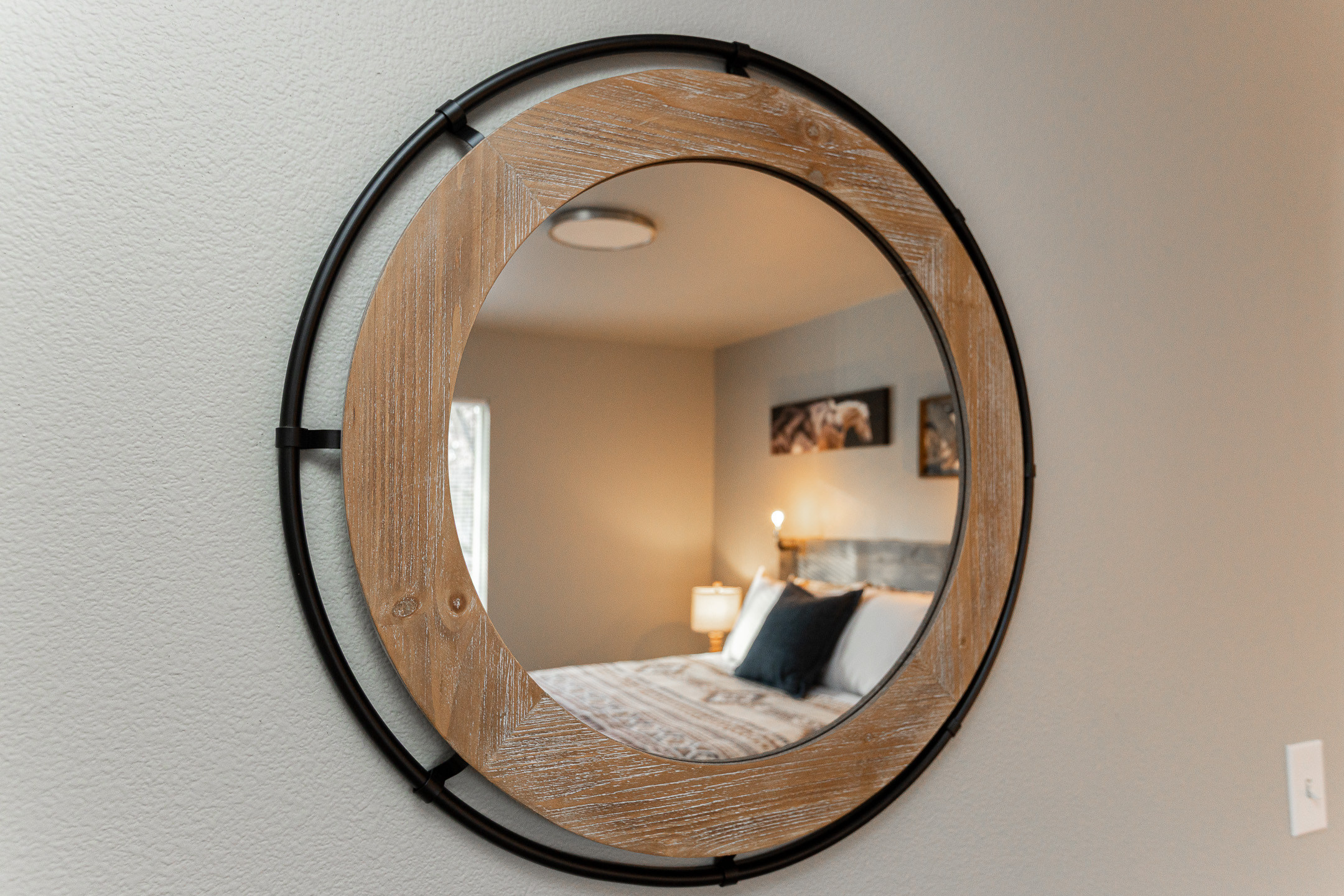 • Three comfortable bedrooms featuring soft bedding and rustic Western touches